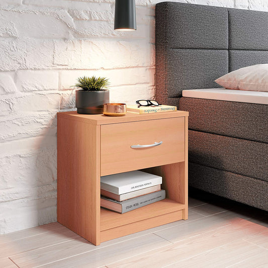 Upgrade your bedroom’s aesthetic with this contemporary bedside table. Its natural wood finish complements any room style while providing essential storage space for books, glasses, and more.